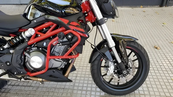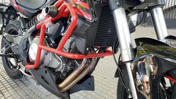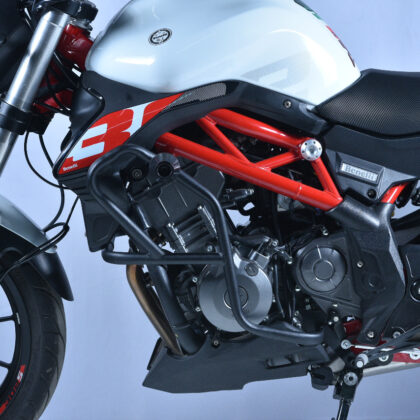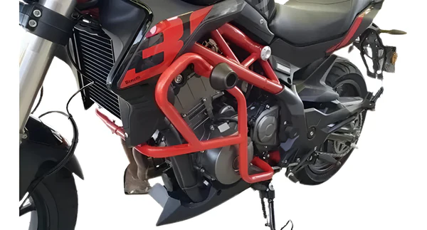 La Defensa con slider Benelli 302s roja está fabricada en caño de acero de alta resistencia, lo que proporciona una protección extremadamente duradera y resistente a impactos para la parte baja del motor.